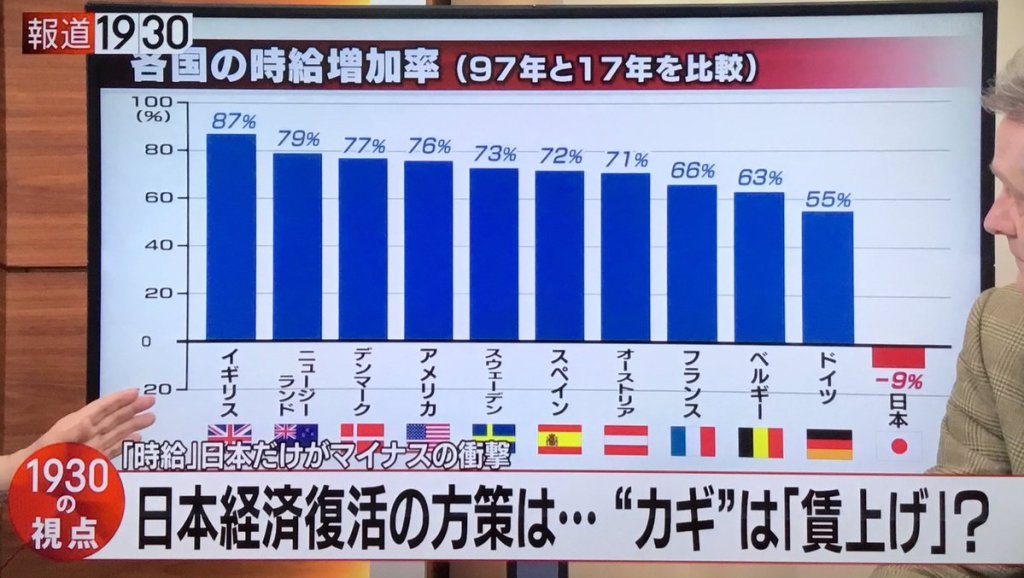 上の図は、報道1930でも紹介されたOECD諸国の時給増加率を比較したグラフだが、下にそれと重ねて同じ国々の20年間のGDP増加率を同形の図にして配置した。相関関係が一目瞭然。二つの統計をセットにして並べると、20年間の経済変化の本質的意味がよく了解される。賃金が削減抑制されたから、消費が伸びず、GDPの成長拡大が止まったのである。この事実を認めないといけない。われわれの共通命題にする必要がある。経済が成長拡大するということは、個人消費が伸びるということであり、必然的に国民所得が上昇するのであって、賃金増加の条件なしに経済規模が拡大することはあり得ない。賃金増加は消費増を通じてGDP増大となり、GDP増大は社会保障を支える税収増になる。三位一体だ。この三位一体範式を日本の左翼は理解しておらず、「最低賃金を上げろ」と唱えた同じ口で、「右肩上がりの時代は終わった」「経済成長を追い求めてはいけない」と説教する。経済的に矛盾した論理と主張を平気で言い続けている。矛盾の自覚がない。だから、「最低賃金を上げろ」というフレーズが異端的でルーティンワークの表象になる。